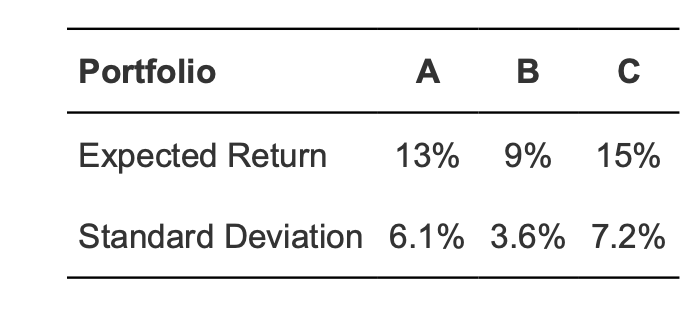 Safety-first ratio Portfolio A: (13 − 3) / 6.1 = 1.64 Safety-first ratio Portfolio B: (9 − 3) / 3.6 = 1.67 Safety-first ratio Portfolio A: (15 − 3) / 7.2 = 1.67
