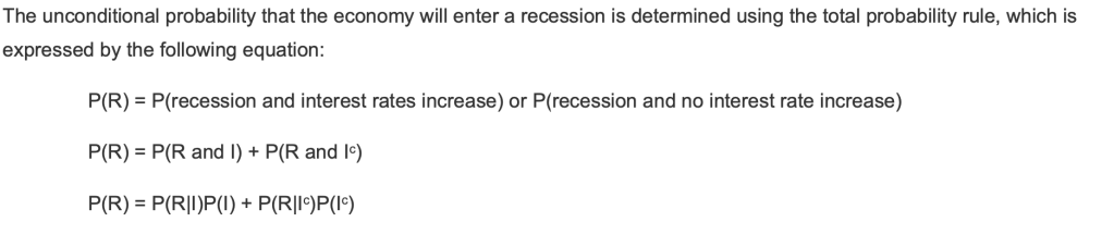 The probability that the economy will enter a recession after the Federal Reserve increases the federal funds target rate is 60%, and the probability that the economy will enter a recession if the Federal Reserve does not increase the federal funds target rate is 10%. The unconditional probability that the economy will fall into recession is determined using the: